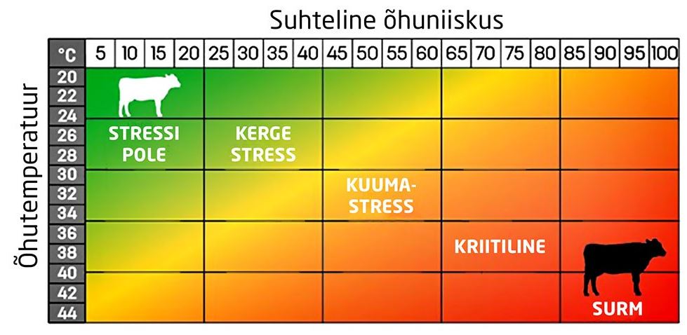Täiskasvanud lehma kehalt aurustub keskmiselt 12 liitrit vett päevas. Mida kõrgem on lehma toodang, seda kiirem on tema ainevahetus ja seda suurem ka tema poolt toodetud soojuse ja veeauru hulk. Õhutemperatuuri tuleb alati vaadelda koos õhuniiskusega. Külmastress tekib madalal temperatuuril siis, kui niiske laudaõhk takistab karvkatte isoleerivat toimet. Talvel eraldub looma väljahingatavast õhust umbes kümme liitrit vett. Külmaperioodil peab farmis õhk vahetuma minimaalselt 4 korda ööpäevas. Silmas tuleb pidada ka seda, et suvel hingavad lehmad välja isegi üle 30 liitri vett päevas. Eestis, kus keskmine suhteline õhuniiskus on suvel umbes 50-60%, on kriitiliseks piiriks 25°C. Sellisel juhul ei ole loomad enam võimelised tekkiva soojushulgaga ise hakkama saama, neil võib tekkida kuumastress ja nende söömus, toodang ning sigimisnäitajad langevad märgatavalt.
